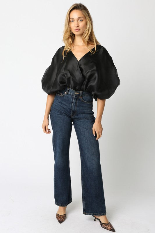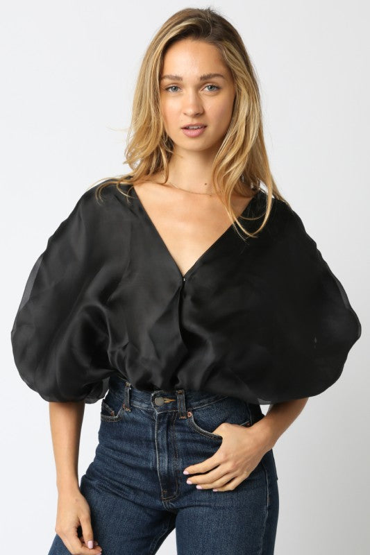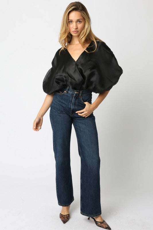 Balloon Bodysuit features a buckle closure and a balloon sleeve. Woven