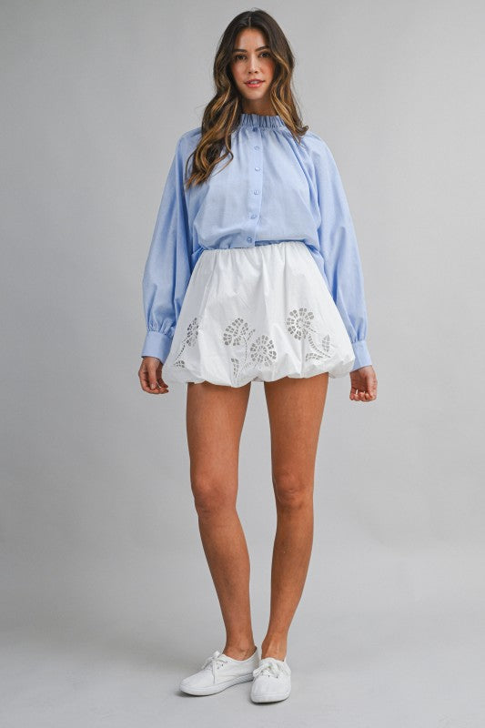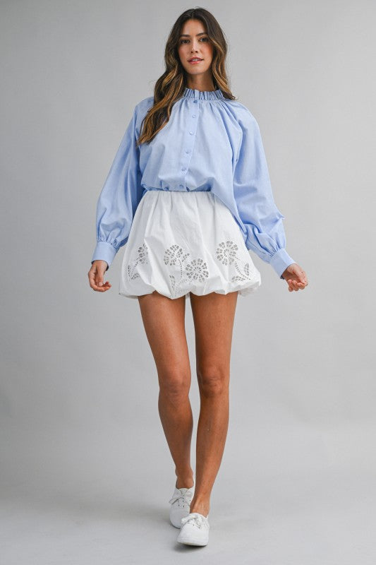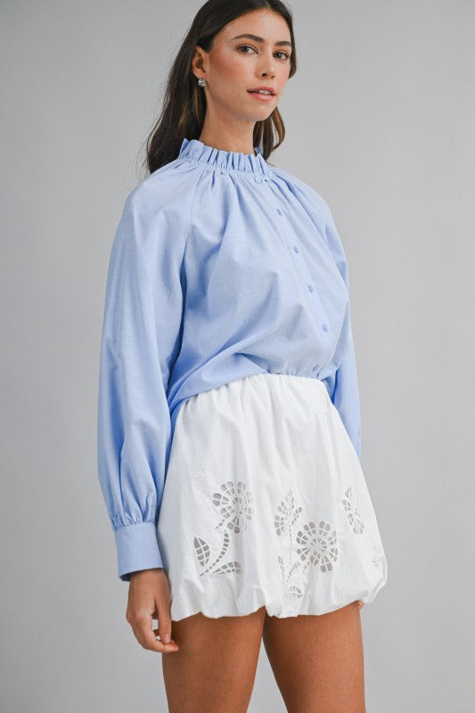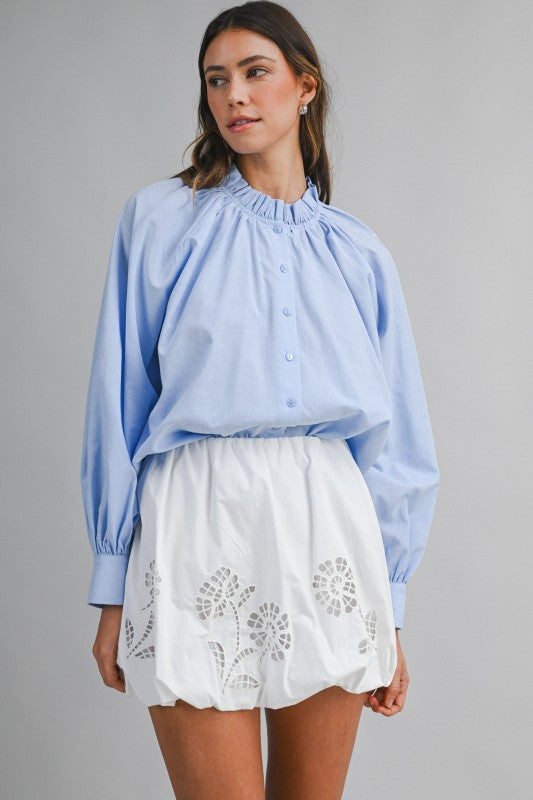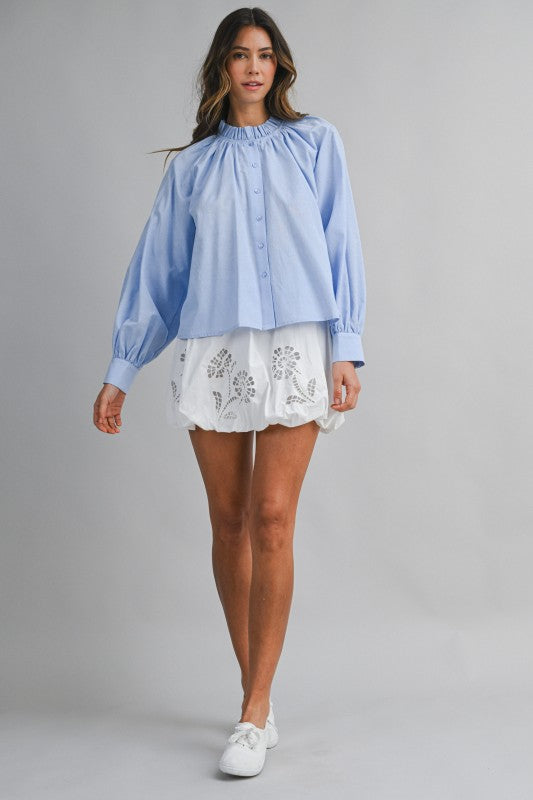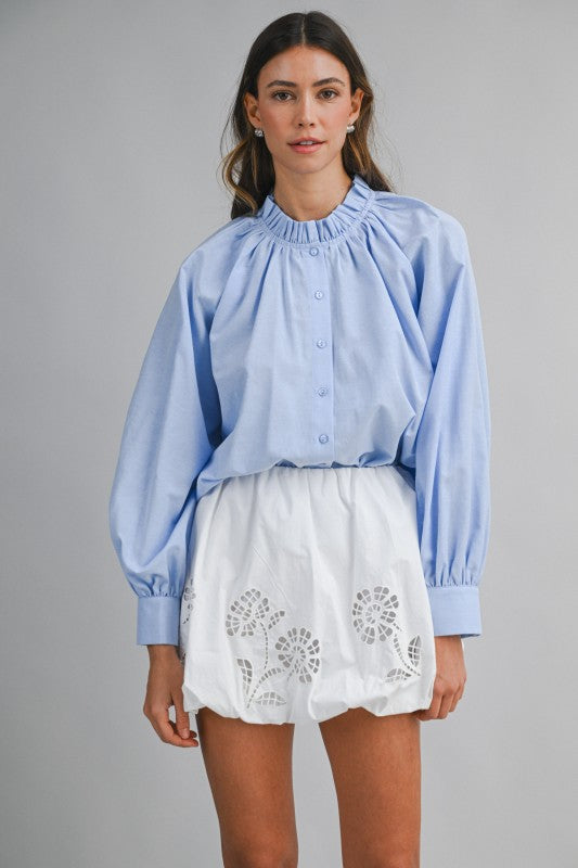 Long sleeve blouse designed with a softly ruffled high neckline and gentle gathering throughout. Features a relaxed, airy silhouette with subtle volume at the shoulders and sleeves. Finished with a full front button closure, elasticized cuffs, and a clean straight hem.
