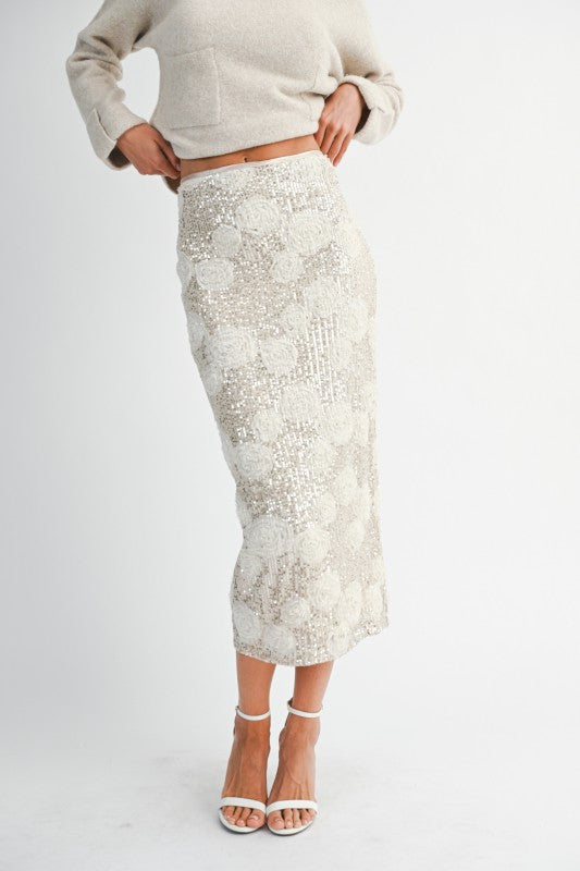 Sequin 3d Floral Applique High Waist Midi Skirt