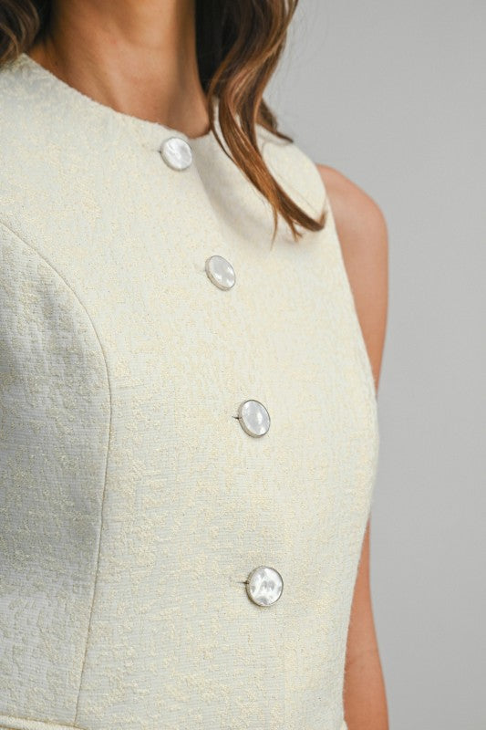 Two-piece tweed set featuring a sleeveless vest top and matching tailored shorts. The top is designed with button down, flap pockets, and a round neckline for a structured. The matching shorts has front hook and eye closure and side pockets. Lining.