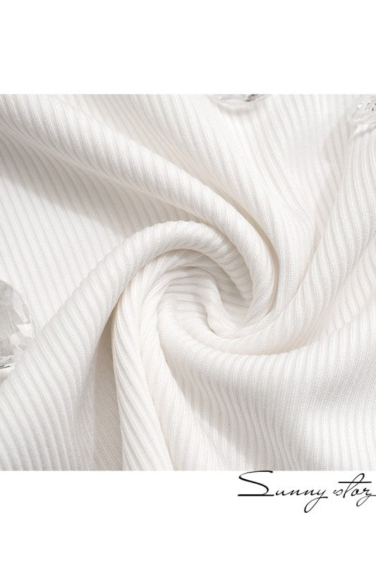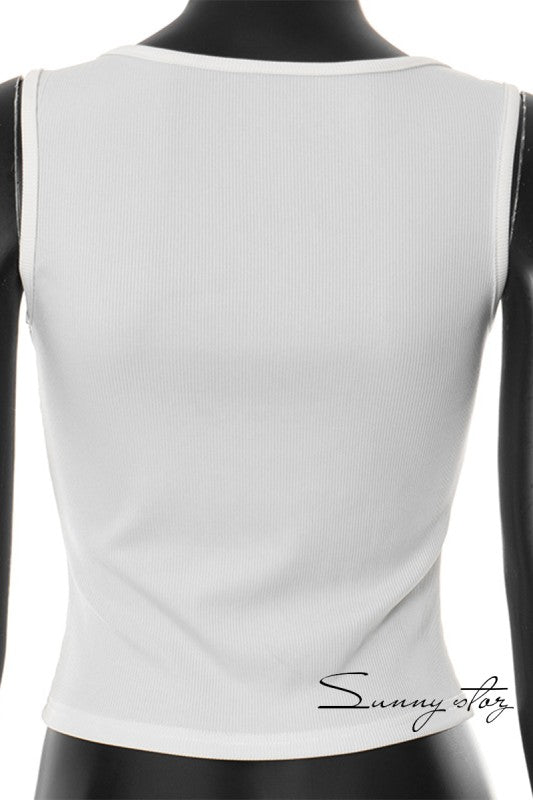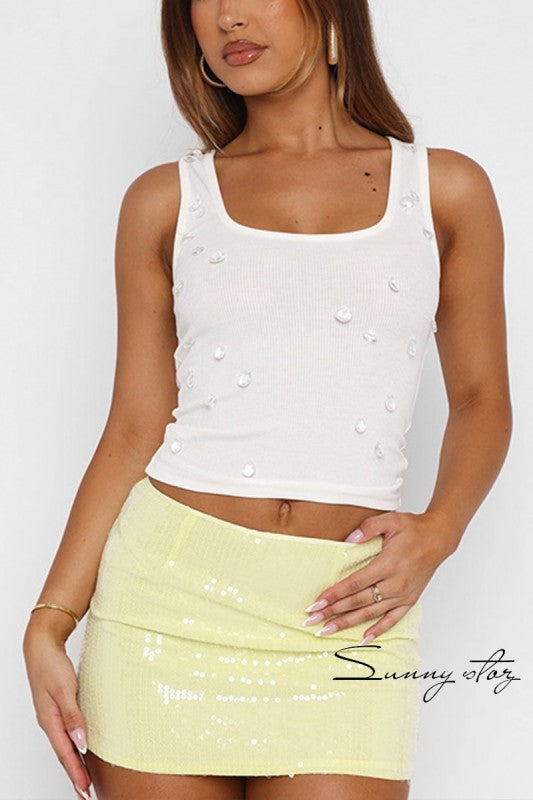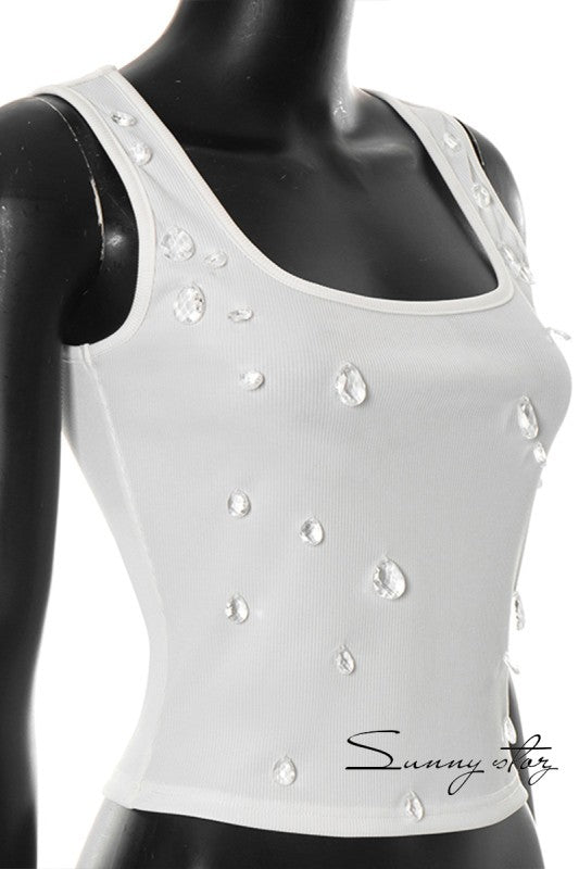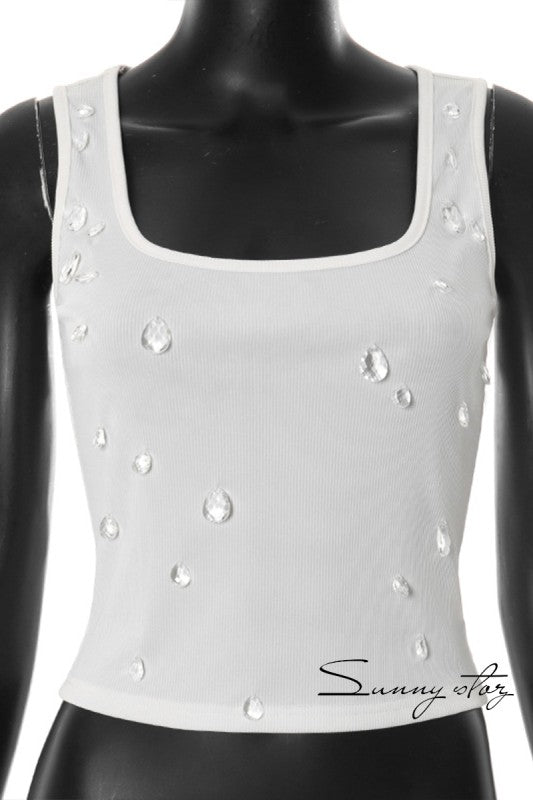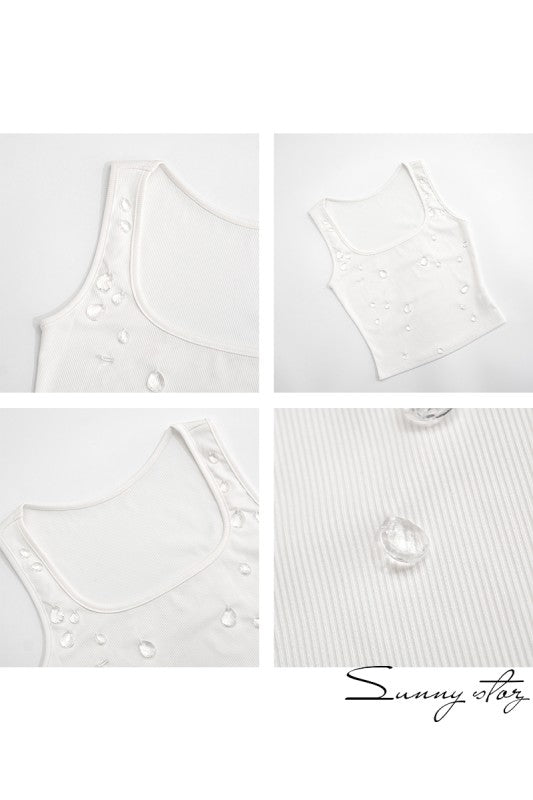 Square neck embellished ribbed tank, sleeveless fitted top, with scattered drop accents.